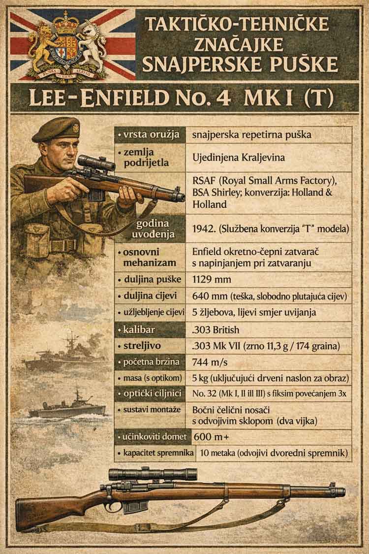 Drugi burski rat (1899. – 1902.) nemilosrdno je razotkrio slabosti takvog pristupa. Južnoafrički Buri bili su civili i farmeri, ali iznimno vješti strijelci s modernim puškama Mauser 7 x 57 mm. Koristili su teren, zaklon i bezdimni barut kako bi preciznom paljbom s velikih udaljenosti nanosili teške gubitke britanskim postrojbama. Dok su se britanske satnije i dalje oslanjale na volumen vatre, burski strijelci gradili su učinak na svakom pojedinačnom zrnu. Lekcija je bila jasna: individualna preciznost je nužnost u modernom ratu. Rovovsko ratovanje na Zapadnom bojištu u Prvom svjetskom ratu pretvorilo je tu spoznaju u egzistencijalni imperativ. Prostor ničije zemlje postao je smrtonosna traka gdje je svako izlaganje glave iznad grudobrana često završavalo metkom nevidljivog neprijatelja. U takvim uvjetima nastaje potreba za posebno obučenim strijelcima koji mogu prepoznati i iskoristiti kratke trenutke izlaganja neprijatelja. Snajperist se iz improvizirane uloge najboljeg strijelca u vodu razvija u specijalista s vlastitom obukom, taktikom i opremom. Evolucija pušaka Lee-Enfield u snajperskoj inačici odražava upravo taj prijelaz. Počela je puškom SMLE (Short Magazine Lee-Enfield) s naknadno dodanom optikom i došla do puške SMLE No. 4 Mk I (T) – totalnog sustava u kojem su oružje, optika, obuka i logistika promišljeni kao cjelina.