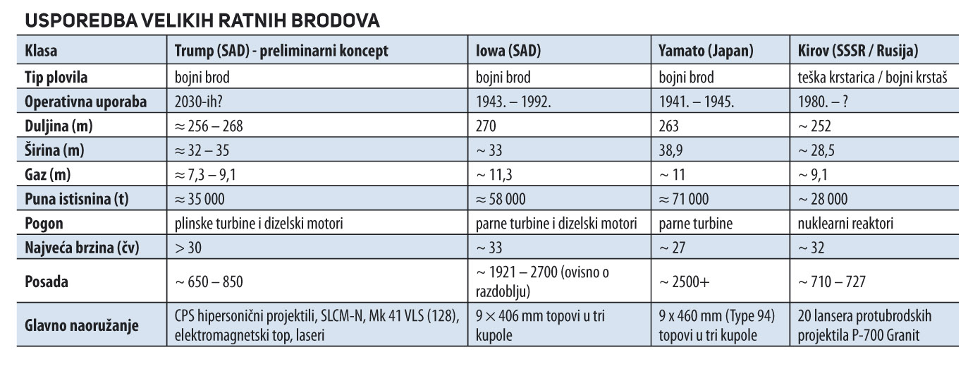 Predsjednik Donald Trump ustvrdio je u obraćanju javnosti da će klasa Trump biti najveći ratni brodovi od Drugog svjetskog rata i prestanka gradnje bojnih brodova. To baš i nije istina. Najveći ratni brodovi ikad izgrađeni su američki nosači zrakoplova na nuklearni pogon, a i druge zemlje imaju nosače. Što je s drugim aktualnim ratnim brodovima? Sovjetska / ruska mornarica izgradila je od početka 1970-ih do kraja 1990-ih četiri bojna krstaša klase Kirov. Gradnja petog otkazana je zbog nedostatka sredstava. Još su uvijek najveći ratni brodovi na svijetu, osim nosača zrakoplova. Doduše, operativan je samo jedan – Petar Veliki (nekadašnji Jurij Andropov). Admiral Nahimov (nekadašnji Kalinjin) trenutačno je u fazi maritimnih testiranja nakon duljeg remonta i modernizacije.