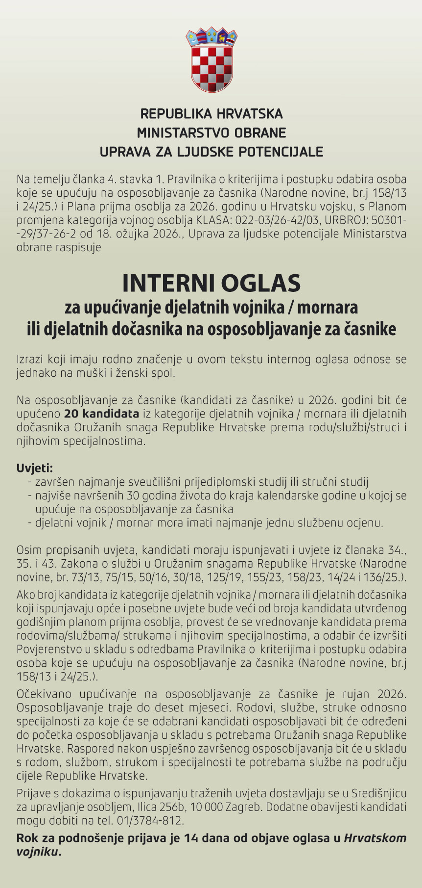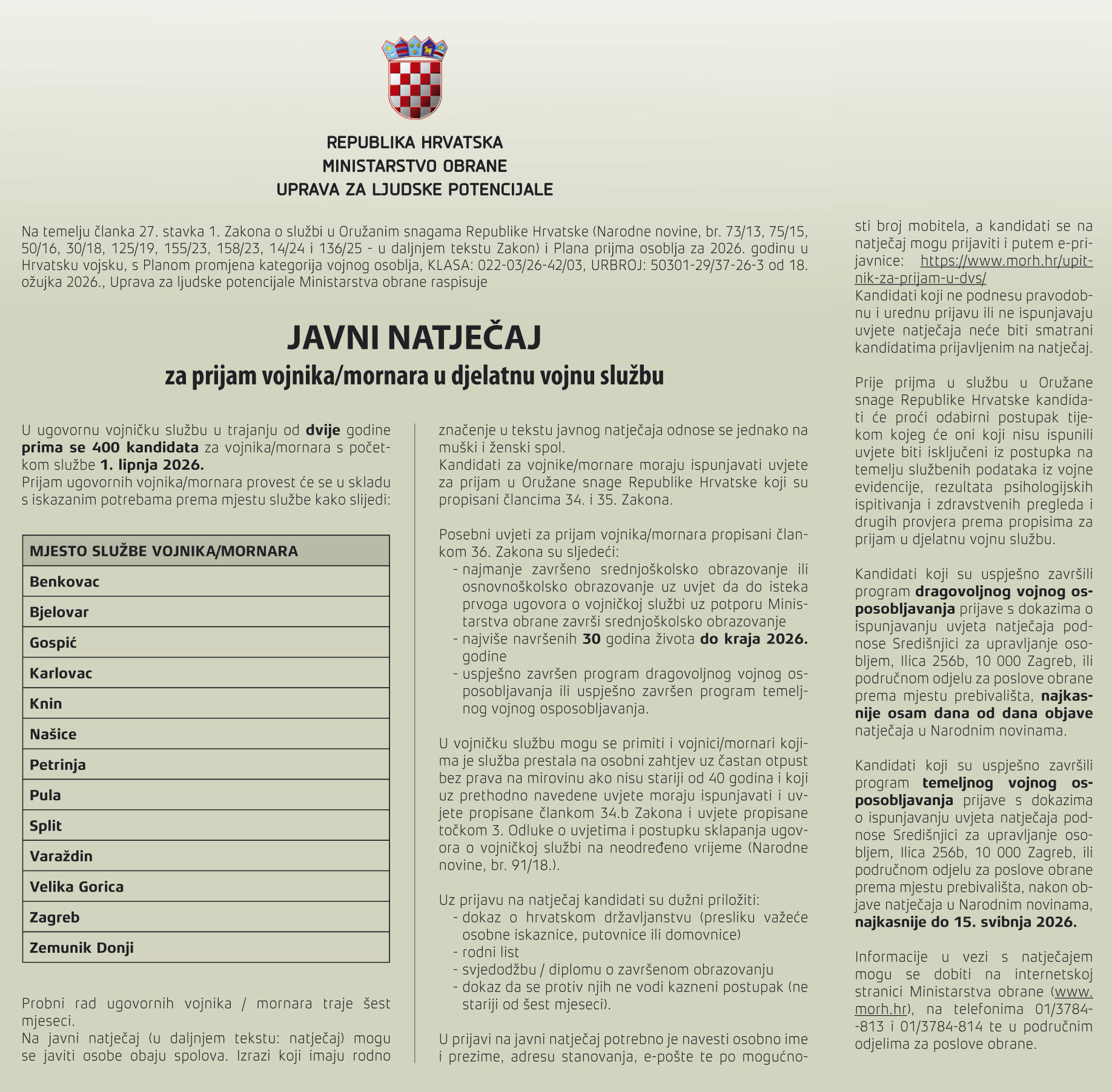 Pošalji dalje: Natječaji i oglasi Broj 759, Razno 22.04.2026 Slični članci Informativni ratni bilten Štaba TO Skupštine općine GračacBilten počinje informacijom da su srpske snage osvojile Lovinac, što je prikazano kao velik uspjeh,… Abeceda akcije Skok 2U organizaciji Zbornog područja Split hrvatske su snage od 4. do 11. lipnja 1995. uspješno… Hrvatska vojska oprema se helikopterima Black HawkU vojarni "Pukovnik Marko Živković" na Plesu predstavljeni su 12. listopada višenamjenski helikopteri tipa Black… Napredna pretragaNapredna pretraga Streljaštvo – kralj vojnih sportovaStreljaštvo je zahvalno za komentiranje jer na kraju se sva preciznost, smirenost i dobar vid…