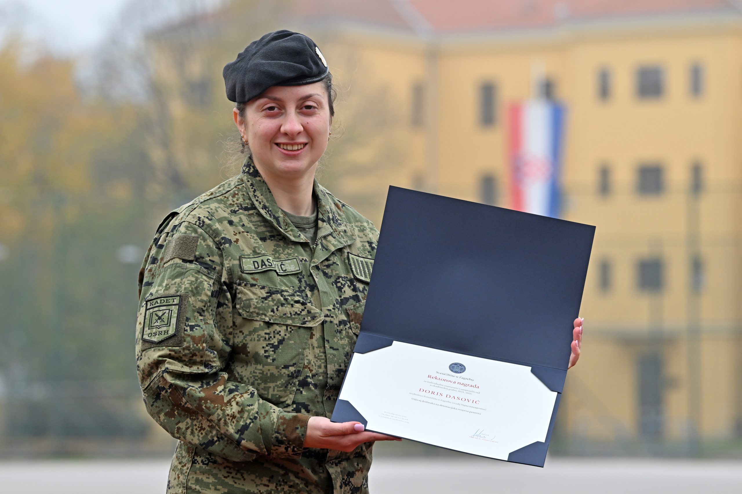 Kadetkinja nadnarednica Hrvatskog vojnog učilišta “Dr. Franjo Tuđman“ Doris Dasović, dobitnica Rektorove nagrade za rad “Utjecaj dodataka na detonacijska svojstva penetrita“, otvorila je prostor za ozbiljna zapažanja koja imaju praktičnu težinu. Dolazi iz Švice, malog sela pokraj Otočca, na prvi pogled, mirna, skromna, ali čim progovori o znanosti, postaje jasno da iza toga stoji golema znatiželja i upornost. Studentica je pete godine studija Vojnog inženjerstva, smjer strojarstvo, rod inženjerija, i jedna od onih koja s lakoćom spaja vojnu preciznost i znanstvenu radoznalost. Iza nje je i nekoliko zapaženih postignuća: osvojila je srebro na natjecanju znanja na CSDP olimpijadi u Budimpešti s radom na engleskom jeziku s temom Effects of the War in Ukraine on the CSDP, sudjelovala je na TMAF-u s radom Innovative Technologies In The Development Of Explosives And Pyrotechnics For Modern Warefare te CMO (Crisis Management Modul) u Latviji na NDA-u.