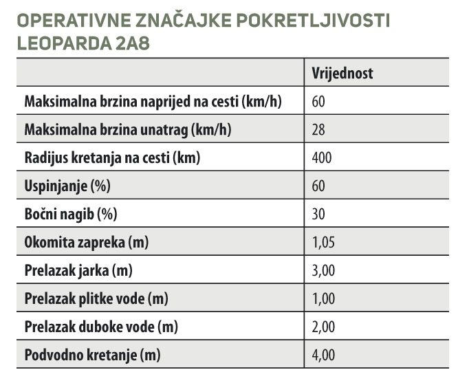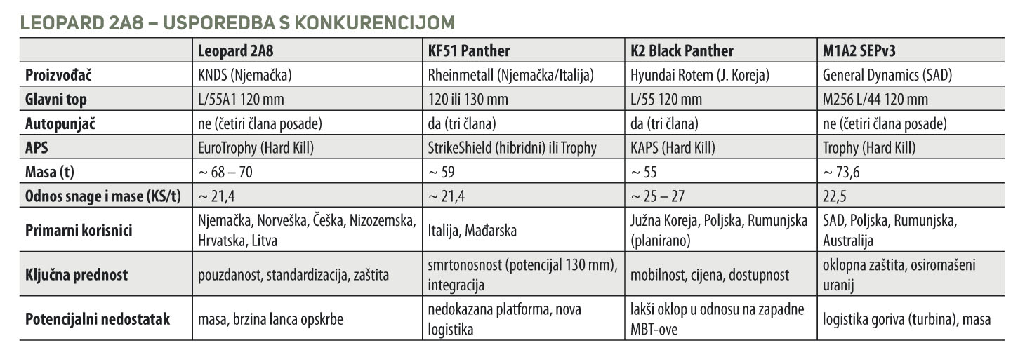 Integracija sustava Trophy APS, potpuno digitalizirana arhitektura, velika vatrena moć i operativna sposobnost za Arktik čine Leopard 2A8 referentnim standardom za treću plus generaciju glavnih borbenih tenkova. U kontekstu hibridnih prijetnji, ratovanja dronovima i protutenkovskih oružja vođenih tehnologijom fire-and-forget, aktivna zaštita i svijest o situaciji nisu luksuz, nego nužnost za preživljavanje na suvremenom bojištu. Ukratko, Leopard 2A8 most je između analognog sustava iz hladnog rata i potpuno digitaliziranog i umjetnom inteligencijom potpomognutog ratovanja iz sredine XXI. stoljeća.