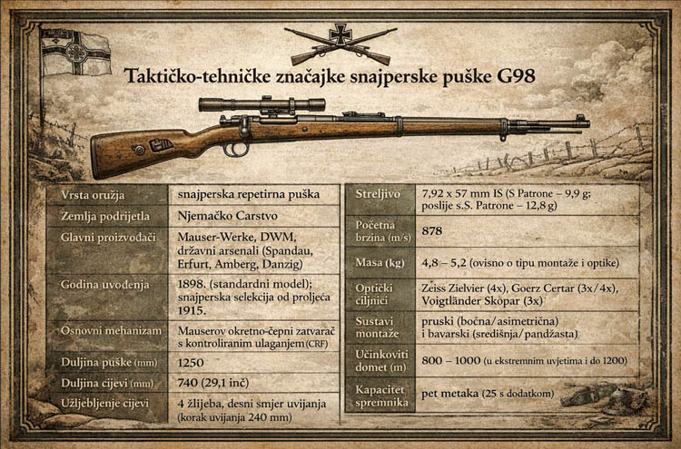 Izbijanje Prvog svjetskog rata krajem srpnja 1914. označilo je dramatičan preokret u vojnoj povijesti. U klaustrofobičnom okruženju ničije zemlje, gdje je svako izlaganje iznad grudobrana značilo gotovo sigurnu smrt, pojavio se hitan taktički imperativ za precizno djelovanje na udaljenostima koje su nadilazile mogućnosti standardne pješačke vatre. Njemačko Carstvo ušlo je u taj sukob s jedinstvenom prednošću, koja nije bila rezultat trenutačne improvizacije, već sinteze duge vojne tradicije lovačkih (Jäger) postrojbi i vrhunske industrijske proizvodnje. Središte te prednosti bila je puška Gewehr 98 (G98). Oružje koje, iako primarno dizajnirano kao standardna pješačka puška, po svojim tehničkim značajkama postaje dominantna snajperska platforma Velikog rata, poznata kao Scharfschützengewehr.