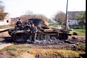 Slijeva nadesno: Ivica Kostanjčar, Damir Šimunović i Adam Ivkov – branitelji Bogdanovaca iz sastava ZNG-a Vinkovci kod uništenog neprijateljskog tenka, listopad 1991. (Foto: Damir Radnić)