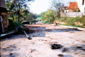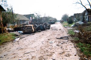 Pogled iz centra Bogdanovaca nakon prvog tenkovsko-pješačkog napada JNA 2. listopada 1991. (Foto: Damir Radnić)